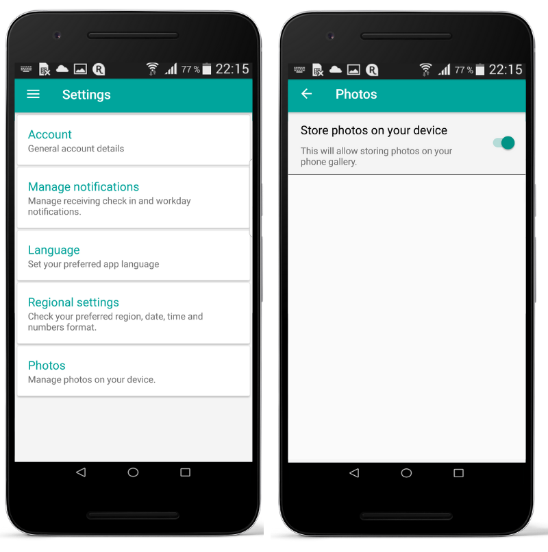 To activate it click on Settings, then Photos and click on Store photos on your device. Once that setting is enabled, all photos from Repsly taken with the photo feature will be stored to the mobile device as well
