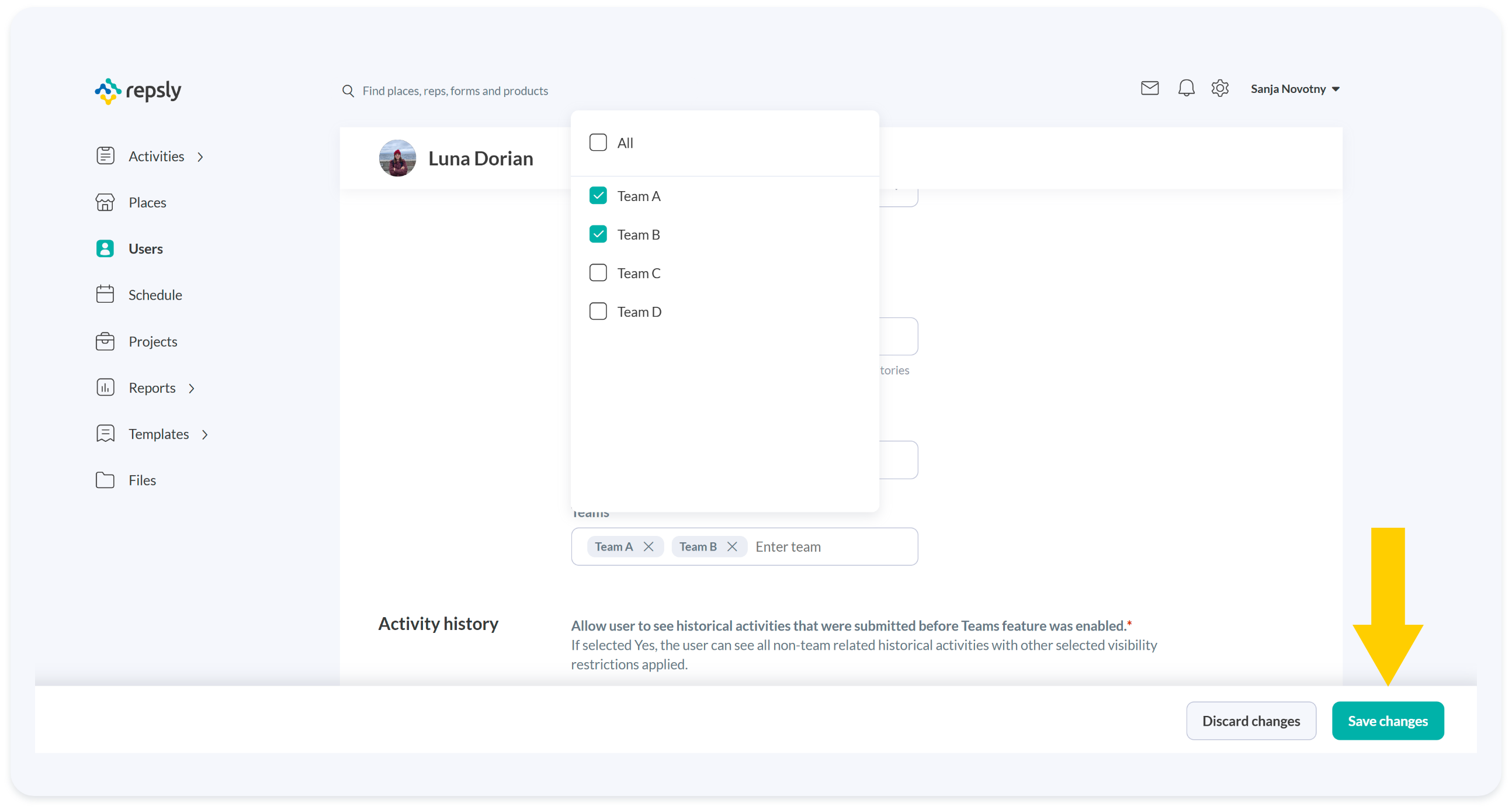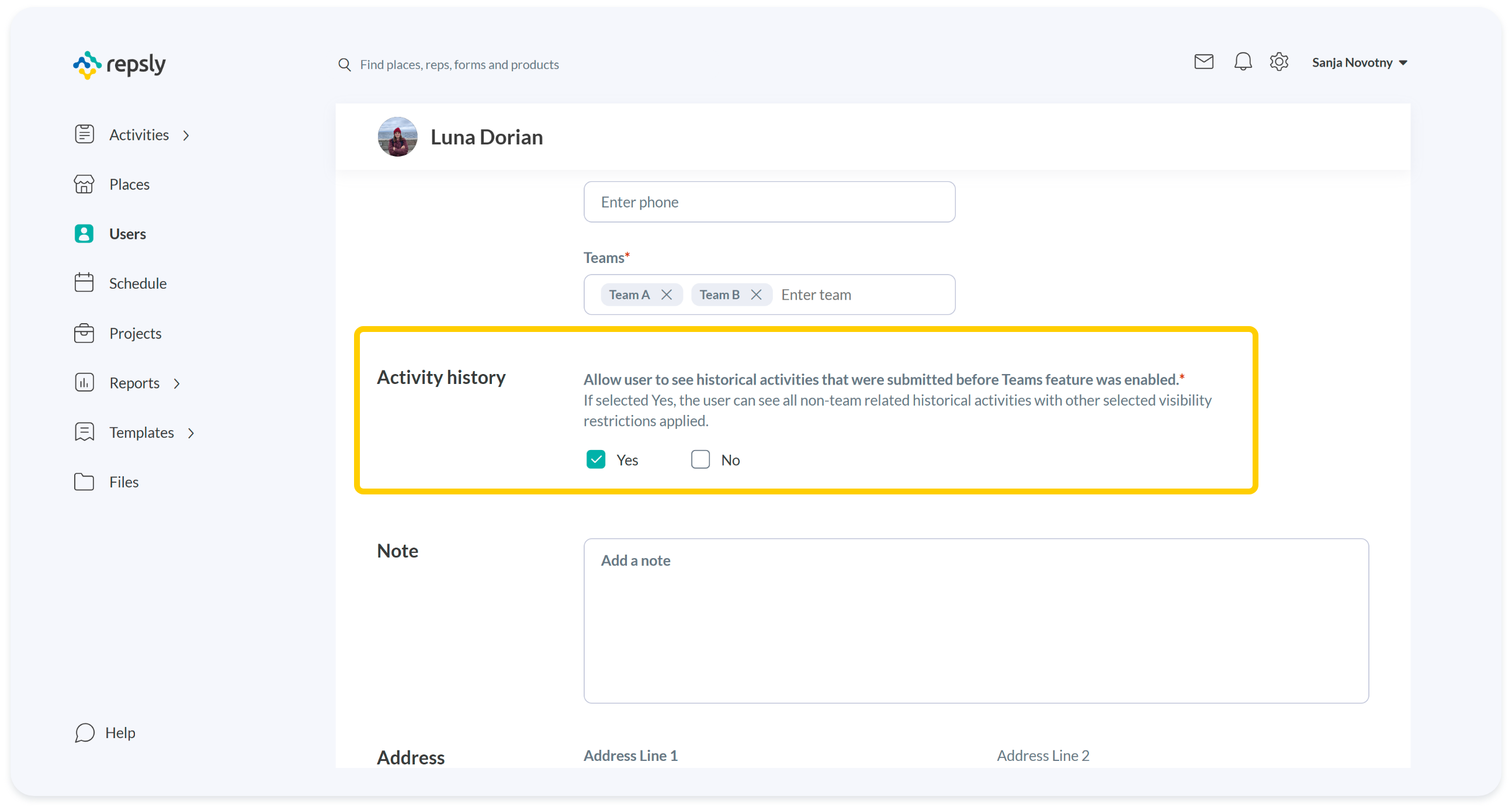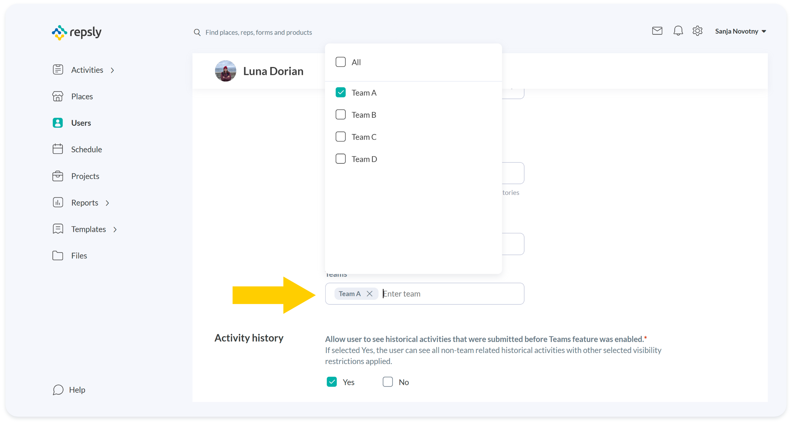 Select whether the user should have access to historical activities submitted before the Teams feature was turned on. Users assigned to all teams automatically have access to historical activities.